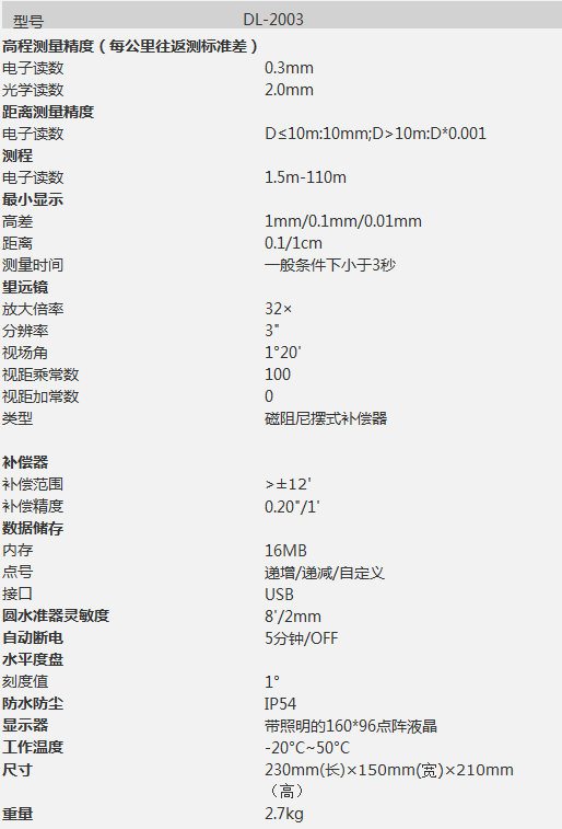 DL-2003提升自动化程度,自动观测、自动记录。提高工作效率和测量精度,避免人为误差,测量精度为0.3mm/km。